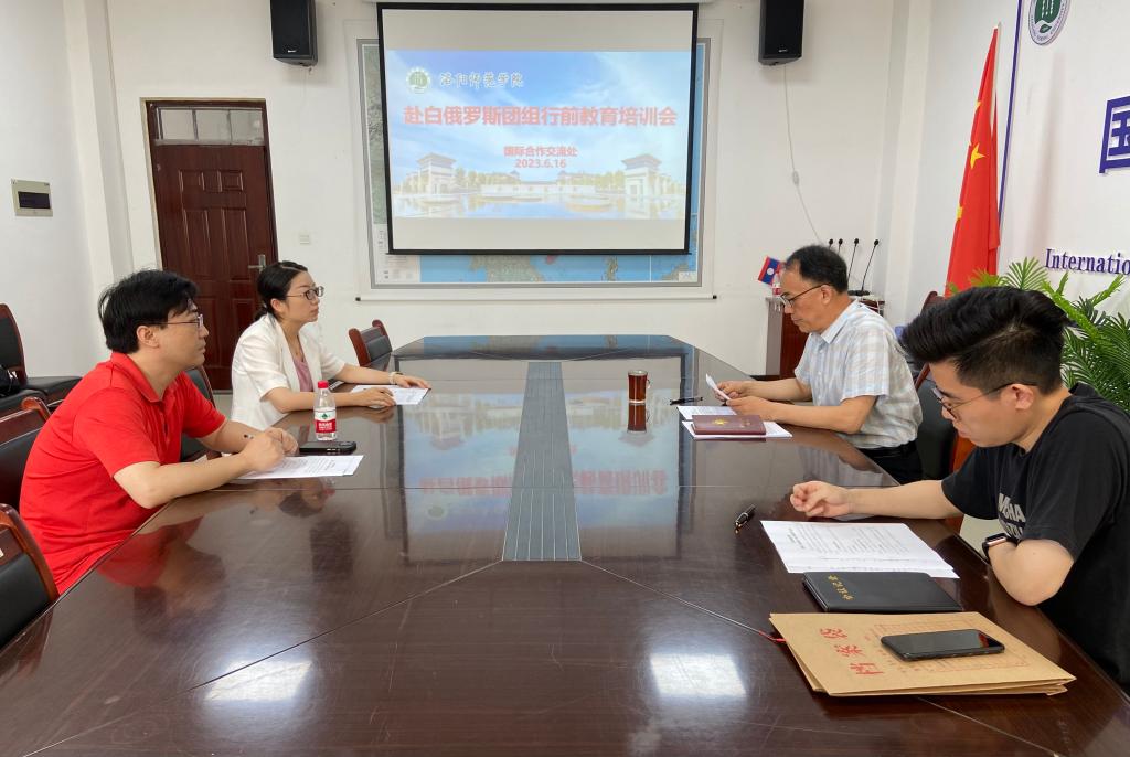 6月16日,国际合作交流处在A1-430会议室召开赴白俄罗斯团组行前教育培训会。国际合作交流处处长曲宏涛,物理与电子信息学院副教授高雅、音乐学院讲师刘哲,以及相关外事工作人员参会。