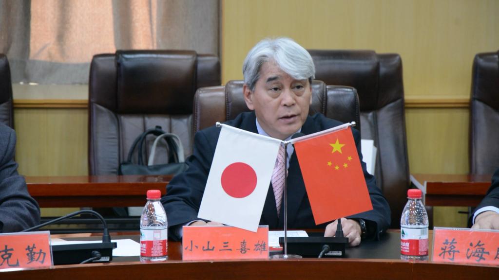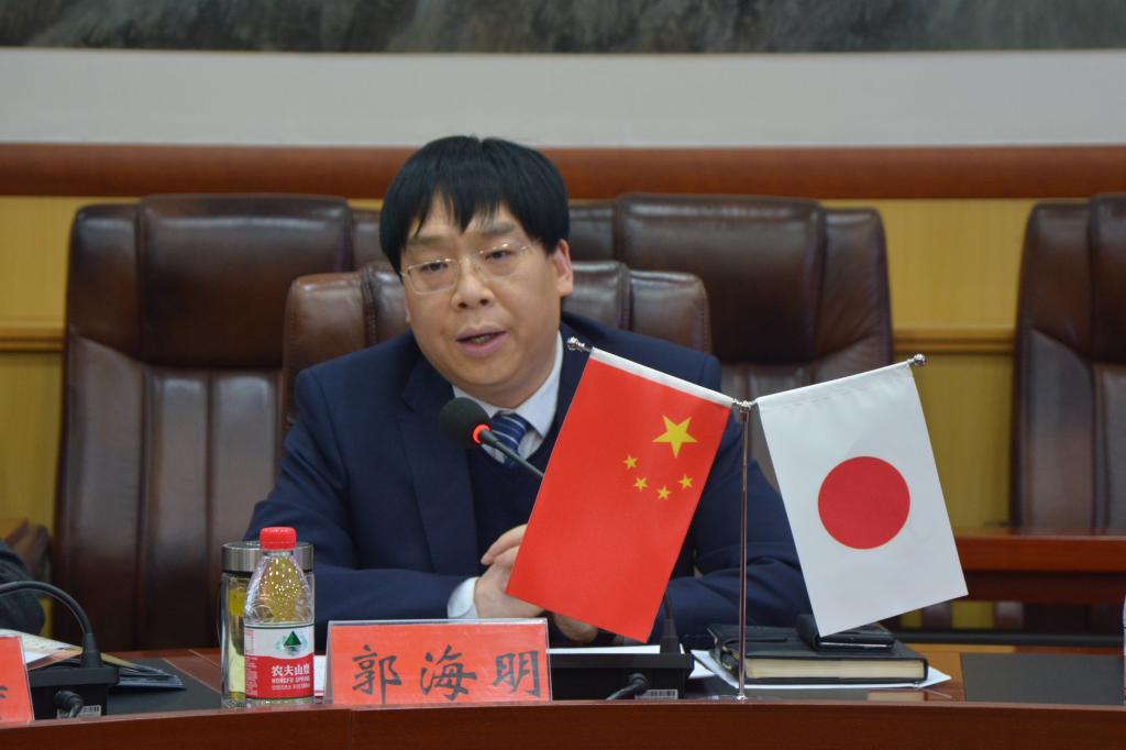 郭海明致辞,对小山三喜雄一行的到来表示热烈欢迎,简要介绍了学校基本情况,以及学校在中外合作办学、师生出国交流、河洛文化国际推广等方面开展的一系列工作。郭海明在致辞中回顾了与三立学院的交流互访。他表示,双方多年合作结下深厚友谊,期望在今后发展中不断密切双方关系,持续深化交流扩大合作,培育更多中日人文交流友好使者,为推动中日关系健康发展做出积极贡献。