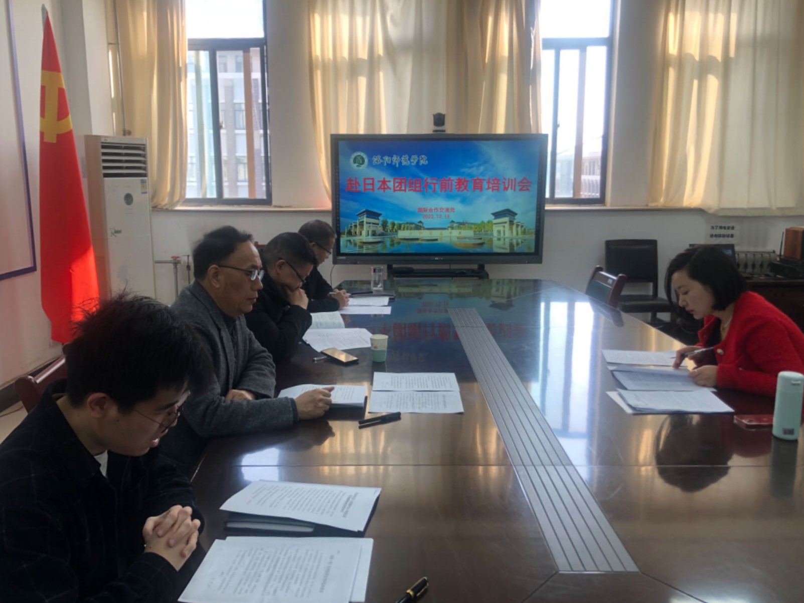 12月19日,国际合作交流处在A1-430会议室召开赴日本团组行前教育培训会。国际合作交流处处长曲宏涛、副处长贾焕杰,商学院院长张成玉,以及相关外事工作人员参会。商学院教师郑菊花参加培训。