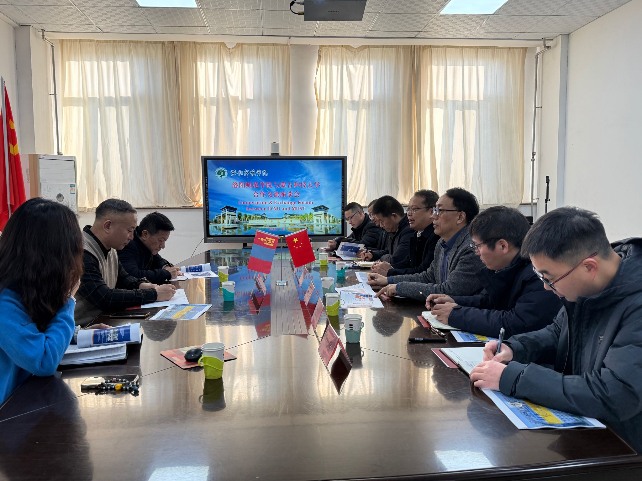 MungunWanchog对我校的热情接待表示感谢,并详细介绍了该校的办学优势。作为蒙古国顶尖综合性高校,蒙古国立科学技术大学在工程科学、信息技术等领域享有盛誉,拥有11个学院及5个研究所,与全球130多所高校建立了合作关系,其国际化办学理念与学科实力为双方合作奠定了坚实基础。他表示,洛阳师范学院的学科特色与育人成果令人印象深刻,期待双方在多领域开展务实合作。