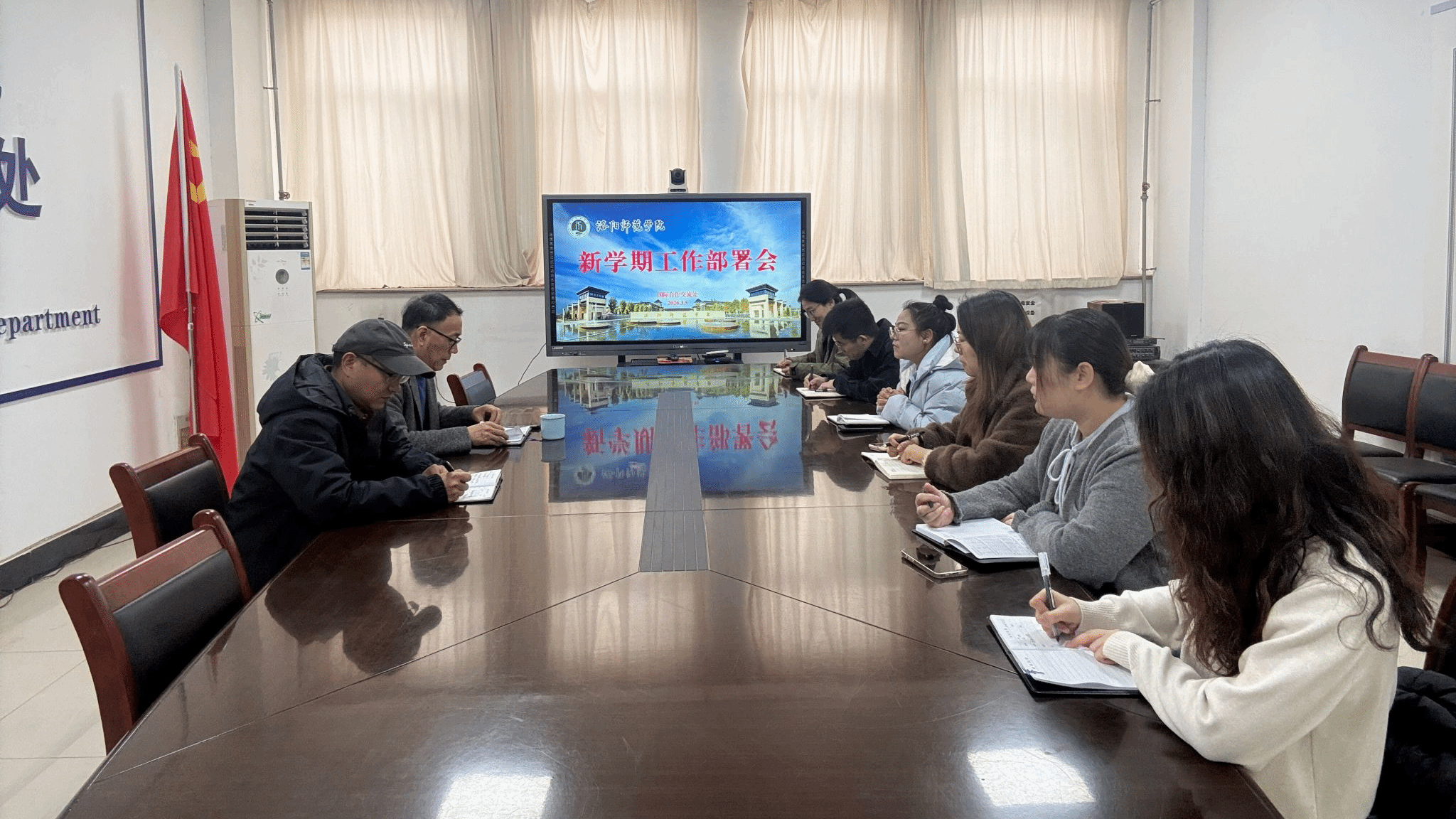 3月5日,国际合作交流处在A1-430会议室召开2026年新学期工作部署会,全体教职工参会。会议由曲宏涛处长主持。