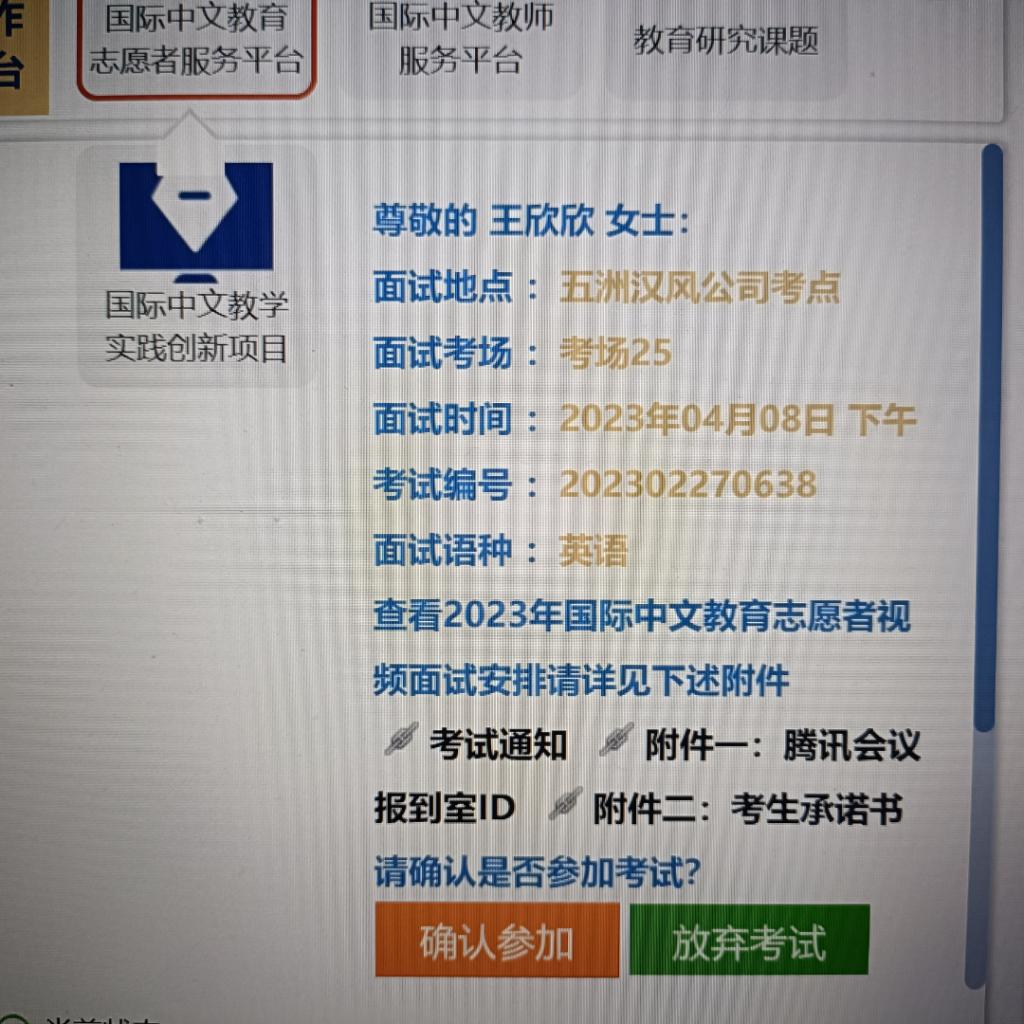 【8月17日】每个志愿者会有一次笔试面试免费考试的机会,也就是国际汉语教师资格证志愿者专场。好消息是笔试通过啦。