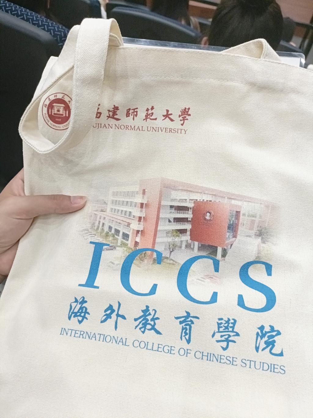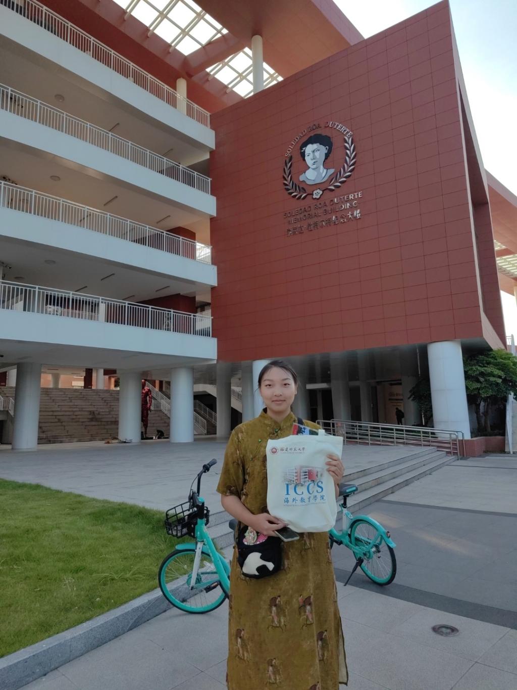 【7月11日】拿着发下来的国际教育学院的帆布袋与福师大索莱达大楼合照,这是一个意义非凡的学院,也是福师大和菲律宾汉语教学深深牵绊的见证。