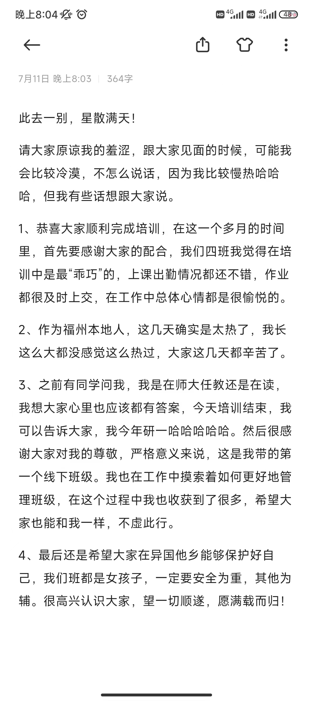赴任大会结束后,我们的带队班主任发了一个便签。此去一别,星散满天!