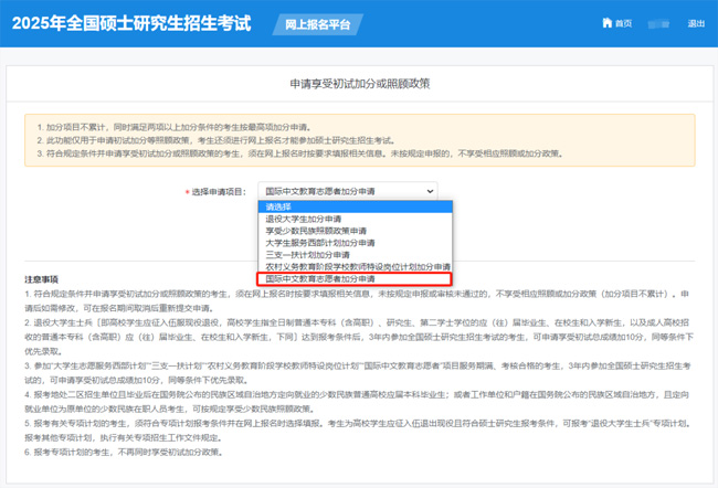 根据教育部印发《2025年全国硕士研究生招生工作管理规定》的要求,符合申请享受考研初试加分政策的国际中文教育志愿者,须在“全国硕士研究生招生考试网上报名平台”(https://yzst.chsi.com.cn/yzwb/index2.html)报名时按要求填报相关信息,由有关部门按职责分工进行审核。未按规定申报的,不享受相关加分政策。