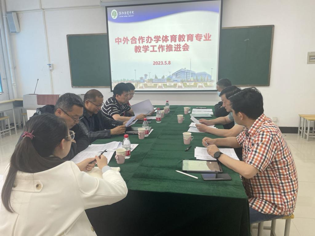 5月8日在A1-323会议室,国际教育学院召开中外合作办学项目体育教育专业教学工作推进会。教务处赵冬生处长、国际教育学院赵峰书记、国际教育学院李华伟院长、国际教育学院裴航副院长、国际合作交流处贾焕杰副处长、体育学院闫树人副院长等部门领导和相关工作人员参会。
