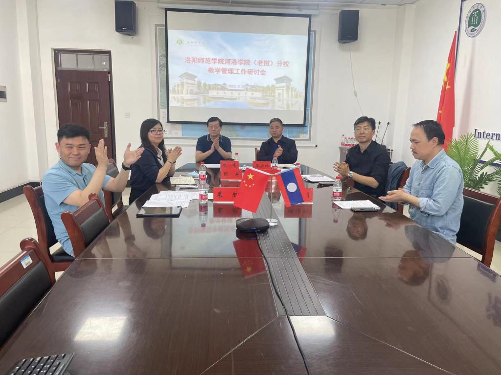 会议就河洛学院(老挝)分校教学管理工作展开研讨。洛阳师范学院国际教育学院赵峰书记和汉澜管理学院党委书记西潘•占塔佩互致问候,共同回顾了河洛学院(老挝)分校取得的成绩和社会影响,双方希望携手努力将老挝分校办的越来越好。李华伟院长结合河洛学院(老挝)分校两年来的运行现状,提出了老挝分校教学管理质量提升的一系列路径和方案,包括强化过程管理、规范结果管理、畅通沟通机制等内容,获得与会各方的赞同。张舜副院长结合中方老师网络授课情况提出了课堂教学的建设意见。于涌副院长还向与会各方通报了汉语国际教育专业人才培养方案的制订进程,并与老挝方探讨了课程设置问题。