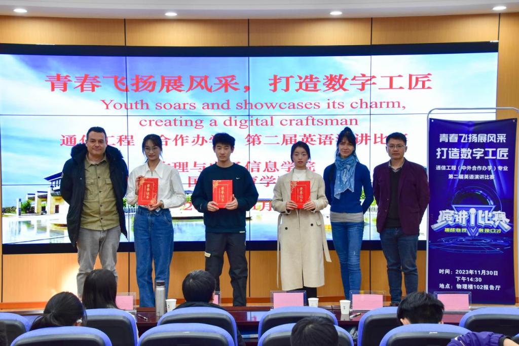 为加强学风建设,培养学生的英语听说兴趣,进一步提升通信工程(中外合作办学)专业学生综合能力。11月30日下午在物理楼报告厅,国际教育学院和物理与电子信息学院联合举办以“青春飞扬展风采打造数字工匠”为主题的第二届通信工程(中外合作办学)专业英语演讲比赛。邀请外教Refael、Madina、教师郭京帅、燕慧英和时永鹏担任比赛评委。