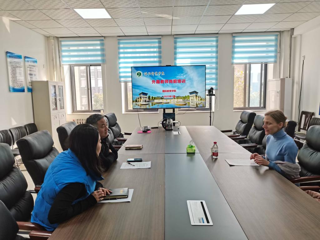 我院于2月16日和17日在A1-328会议室举办2025年春季外籍教师岗前培训会,国际教育学院院长李华伟、副院长曹燕子、及Hailina、Par和Vasilii三名外教参会,会议由曹燕子主持。