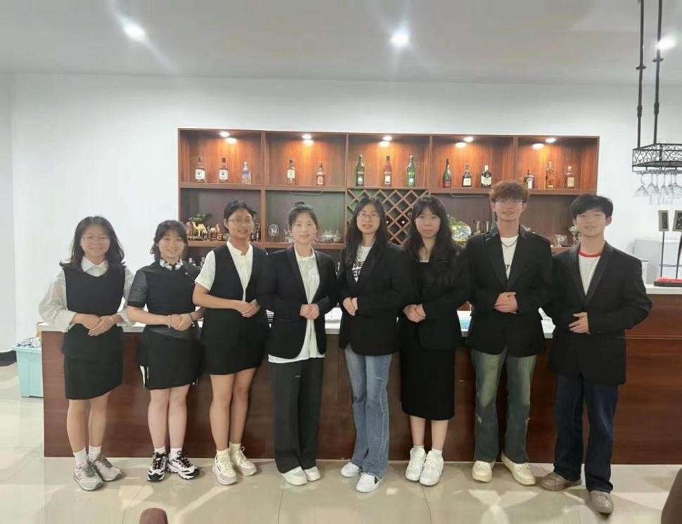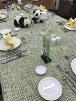 活动当天,学生们早早地聚集在活动场地,经过一番讨论选择了以国宝——  熊猫为主题的餐台设计。首先,他们精心选择了一块与主题相契合的绿色花纹台布,将其平整地铺在餐桌上,远远望去好似竹林投下的光影撒在了桌上。接着,他们按照要求细心摆放每一件餐具的位置。为了增加主题的独特感,他们还精心选择了一些装饰物,如在小巧的花瓶中插上来一节竹子和带有熊猫的餐牌增加了主题的氛围感。两个熊猫玩偶在桌子中间相对摆放,像在竹林中玩耍般。这些装饰物为用餐环境增添了一丝生机和趣味。