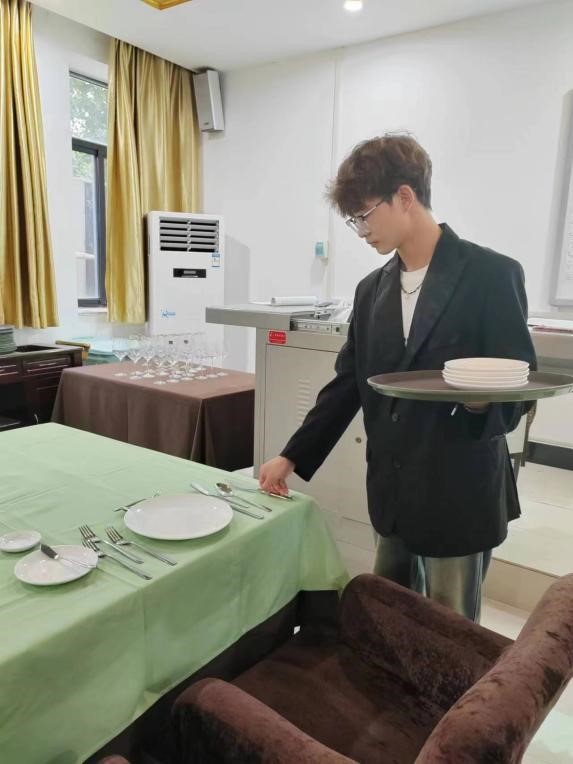 此外,学生们还学习了餐巾的折花技巧,并选择了黄色的餐巾,为绿意盎然的餐桌增添了一抹别致的色彩。他们将折好的餐巾巧妙地摆放在餐盘中,使整个用餐环境更加精致。