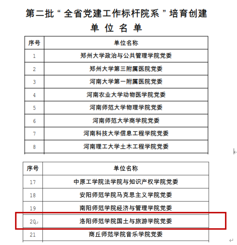 近日,河南省教育厅正式公布第二批全省高校党建工作强基引领“三级联创”培育创建单位名单。洛阳师范学院国土与旅游学院党委(现更名为地理与旅游学院)获评全省党建工作标杆院系。