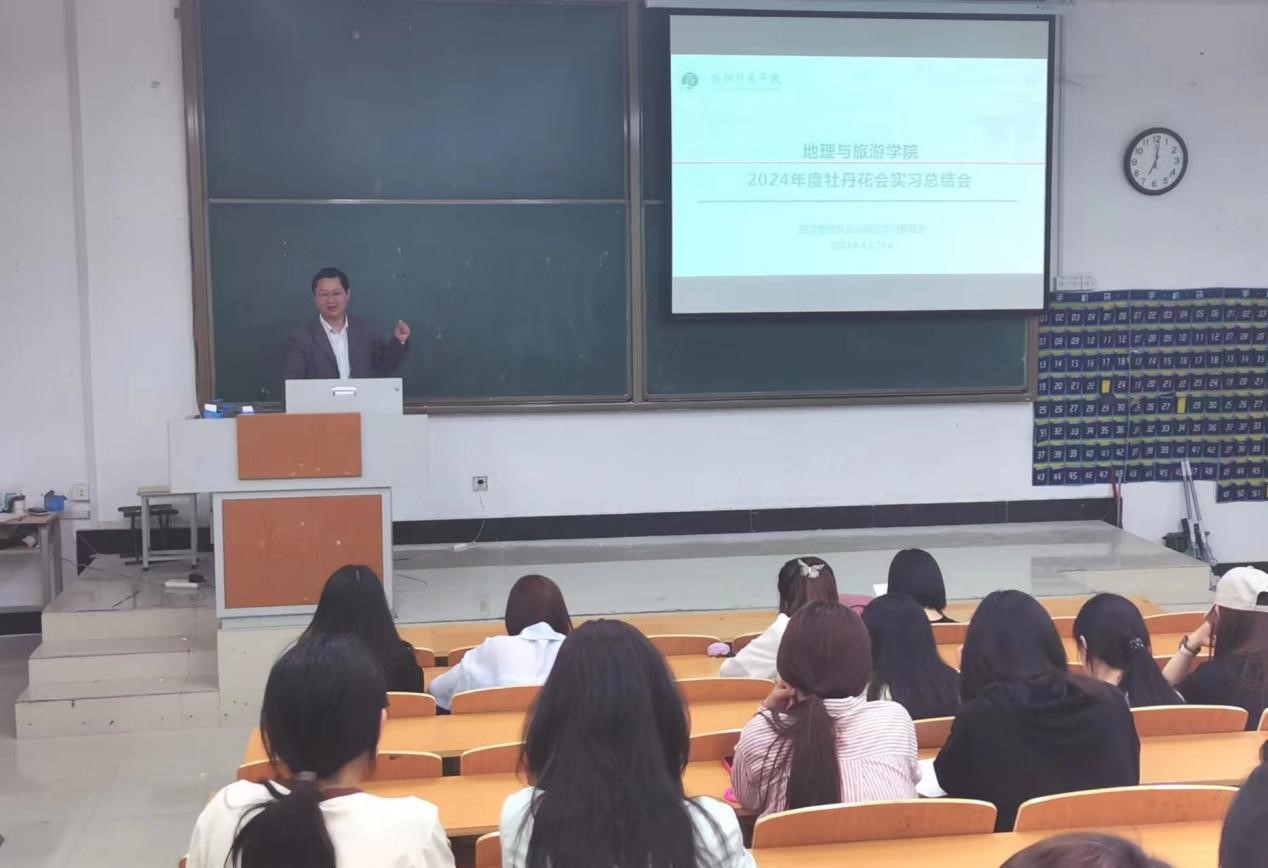 4月24日下午,我院2024年度牡丹花会实习总结会在学院104教室举行。2022级全体实习生,校内实习指导老师、校外实习带队老师等参加了会议。地理与旅游学院副院长王洪瑞出席了会议。会议由旅游管理系系主任曹威威主持。