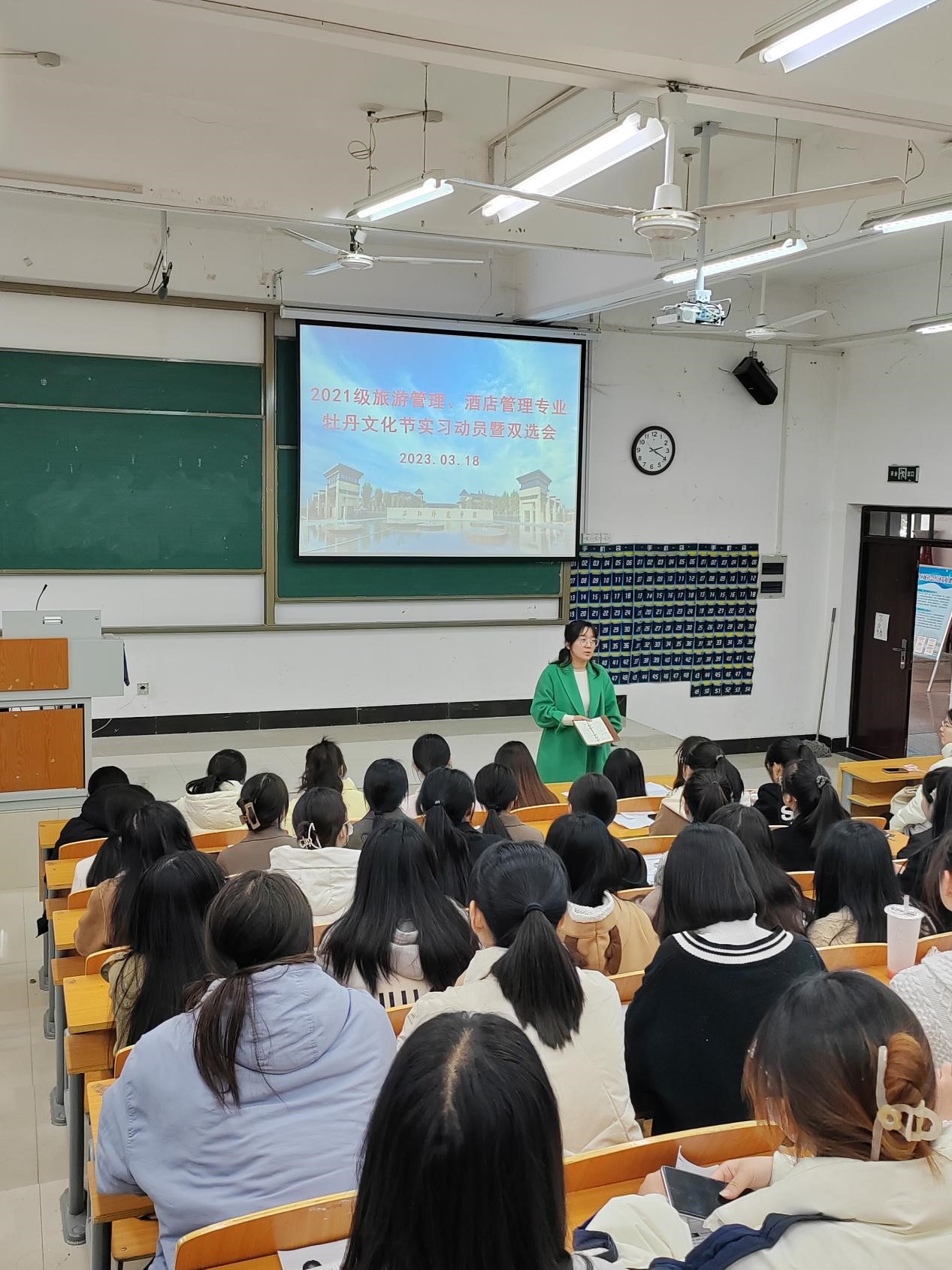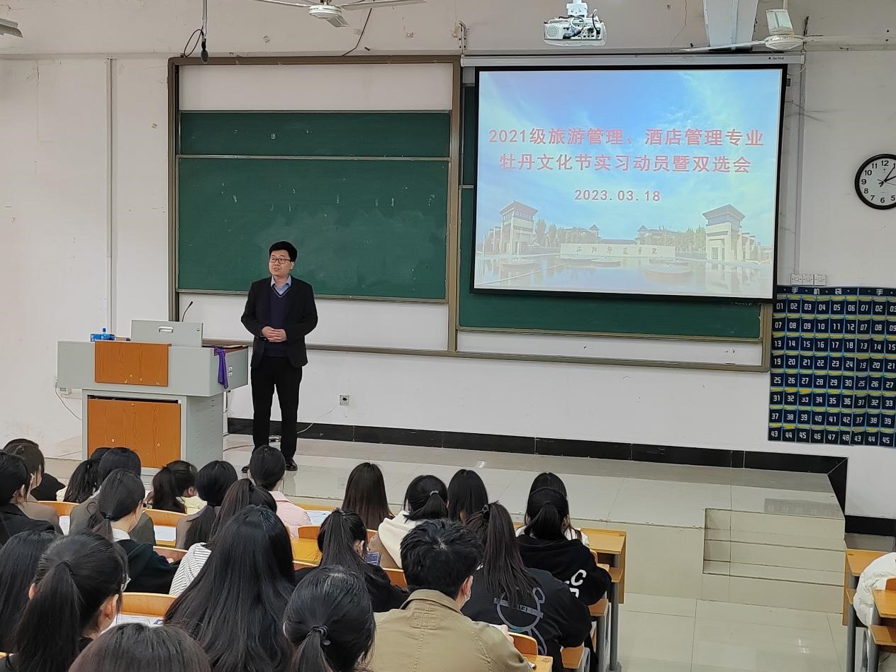 花会实习是旅游管理、酒店管理专业实习体系的重要组成部分,学院对此高度重视,3月18日下午两点,国土与旅游学院在A2-104举行了花会实习动员会。首先,旅游管理系主任曹威威向同学们介绍了本次双选会情况,对同学们说明了学院的规定和期盼;21级辅导员谷智阳老师对同学们作了安全等方面的叮嘱;学院副书记李佳书记对学生安全问题、思想问题进行了强调,并预祝花会实习顺利圆满完成,秦一迪老师讲解了实习双选中学生的注意重点并布置了实习任务,殷华华老师为大家布置了劳动教育课程任务。