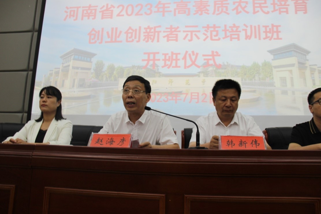 赵海彦副校长代表学校向培训班的顺利开班致辞,他介绍了洛阳师范学院近年来在人才培养、科学研究、合作办学、文化传承、社会服务等方面取得的成绩。同时对承担本次培训的国土与旅游学院给予了充分肯定。他表示,此次培训是学校贯彻农业农村部和农业农村厅的政策要求、积极助力乡村振兴的重要举措,也是学校积极开放办学、履行社会服务职责的责任担当。今后学校将充分发挥学科优势和人才优势,继续为河南省造就高素质新型职业农民提供智力支持,奉献真知灼见。