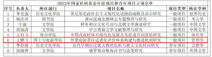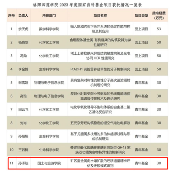 近日,国家自然科学基金委员会、全国哲学社会科学工作办公室分别公布了2023年度国家自然科学基金及2023年度国家社科基金项目立项名单,我院孙泽航博士申报的《矿区重金属向土壤扩散的迁移通量精准评估及迁移模式识别》课题获国家自然科学基金青年基金资助,王鹏飞博士申报的《智慧旅游景区适老化评价体系构建与推进机制研究》课题获国家社科基金项目(一般项目)立项。