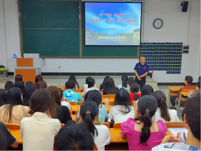 为深入贯彻落实习近平新时代中国特色社会主义思想和党的二十大精神,确保主题教育效果落到实处,加快一站式学生社区建设,做好我院学生思想引领和组织建设工作。9月6日,我院党委书记刘振中在A2-104会议室为学院青年学生干部讲授以《统一思想,凝心聚力——加快推进“一站式”学生社区建设》为主题的“开学第一课”。
