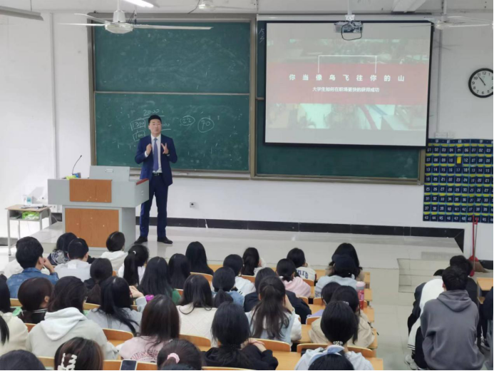 张洋以“你当像鸟飞往你的山——大学生如何在职场更快地获得成功”为主题,用“我是谁、山在哪、如何飞”三个形象的问题,分别从个人角色认知、未来目标选择、大学学习规划三个方面为我们全面讲解了大学生职业生涯规划。张洋结合自己的职业经历,讲述了如何从一名普通的酒店礼宾员通过十年的努力成长为企业高管的故事,详细讲解了在大学阶段,如何正确认识自我,发掘自己的优势,认清自身不足,指导同学们如何确定学习目标和职业发展目标。针对未来职业生涯,提出通过不断学习、增强实践、提升技能、培养人际关系等,做好未来规划。