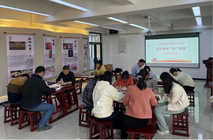 2023年10月26日下午,土地资源管理教工党支部在龙门书院一号院三楼非遗文化馆开展了保护耕地“动”起来—主题党日活动,土地资源管理系全体教师和部分学生代表参加了活动,活动由土地资源管理教工党支部书记方明主持。