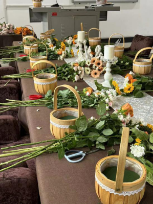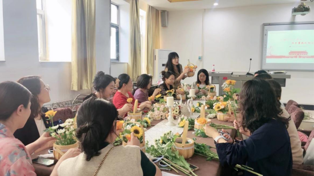 在插花教学活动中,支部党员教师秦一迪向参加者介绍了花卉知识,并进行现场教学。学员经过插花实践,基本掌握了插花技巧,都能手到花来。一篮篮盛开的鲜花,造型优美,花枝飘香,飘出了美丽心情。