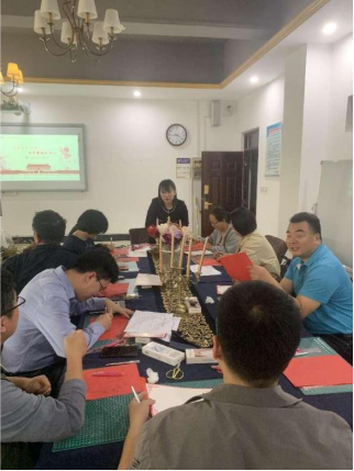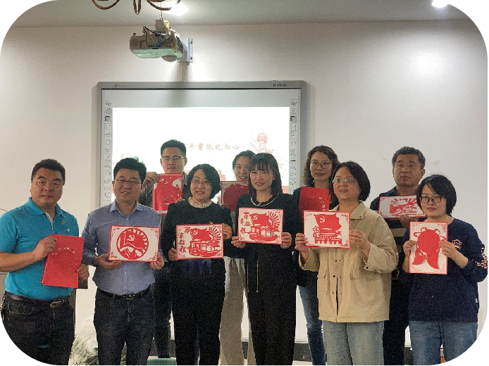 在剪纸教学活动中,支部党员教师殷华华向参加者介绍剪纸艺术,并进行现场教学,随后参加者亲手进行剪纸创作,剪出了旅游宏图前景,划出了党旗飘飘,刻出了国泰民安。