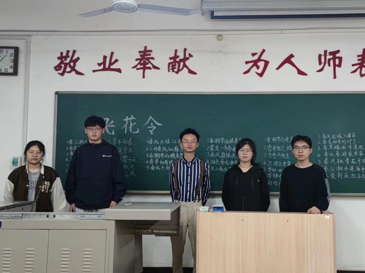 “飞花令”原是古人行酒令时的一个文字游戏,饱含诗词之趣,得名于唐代诗人韩翃的名句“春城无处不在飞花”。本次活动以‘江、花、月、夜’为关键词(同音字亦可),以古诗词曲、毛泽东诗词为范围,每位参赛者从中选择一个关键字做准备。选择相同关键字的参赛者为一组赛事,抽签决定飞花顺序,应最多句者从本轮获胜。小组赛事完毕后,几位小组获胜者继续以“春”字为关键字对决出最终胜者。比赛现场,个个妙语连珠,鏖战数个回合,你对一句,我接一句,互不相让,从海上明月共潮生到杏花春雨江南,从山水田园牧歌到金戈铁马阳关,同学们吟诵着千古绝句,体味着人间百态,体会着中国诗词永恒的魅力,激烈精彩的角逐赢得台下观众阵阵掌声。