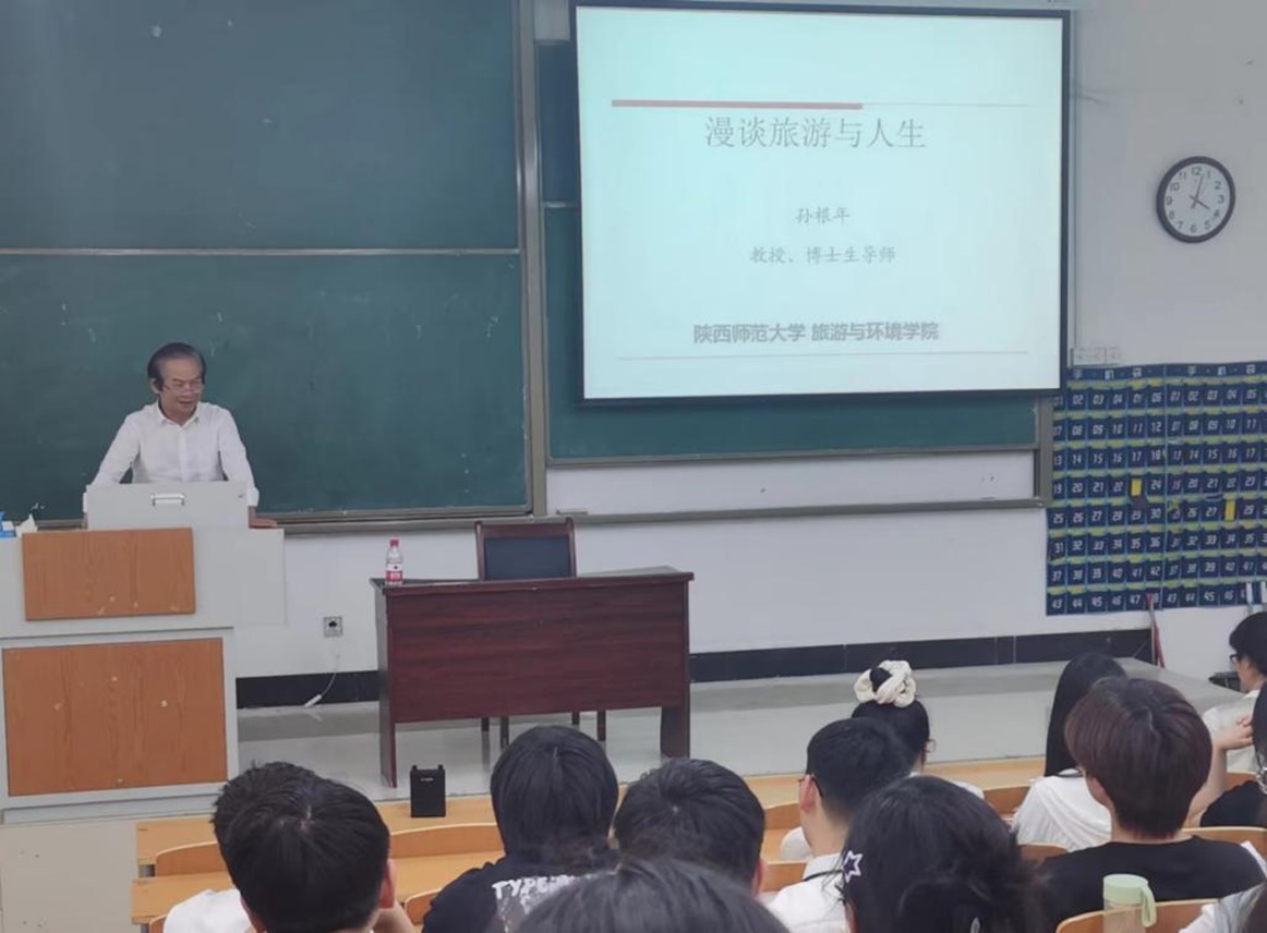 为开阔我院旅游管理专业学生的学术眼界,增进专业认知,提高学生的专业认同感,培养学生学术能力,2024年4月17日我院组织“校外名师进课堂”专题学术讲座活动,邀请陕西师范大学孙根年教授为我院2023级旅游管理专业学生作题为:“漫谈旅游与人生”专题讲座。讲座由地理与旅游学院副院长王洪瑞教授主持,学院部分教师参加了讲座。