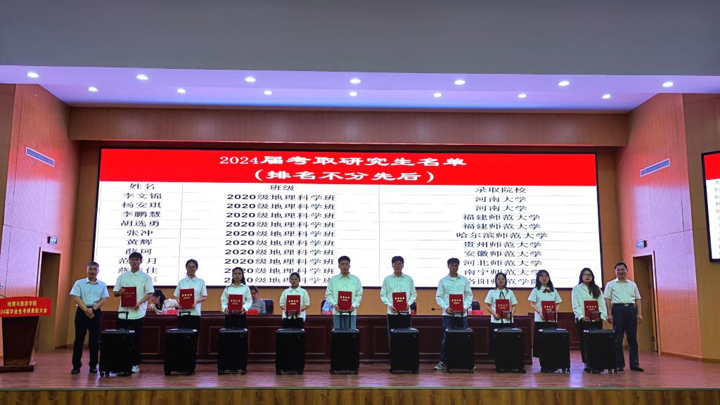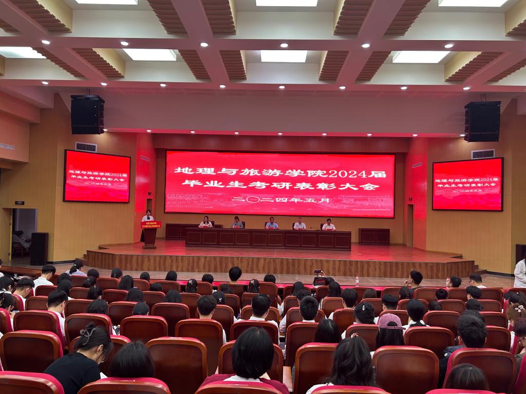 为表彰考研优秀学子,激励学生赓续奋斗,弘扬优良院风学风,地理与旅游学院于5月14日在G1-112举行了2024届毕业生考研表彰大会。地理与旅游学院班子成员以及辅导员、班主任代表出席会议,参加本次会议的有2024届考取研究生的全体学生和在校生代表。会议由党委副书记李佳主持。