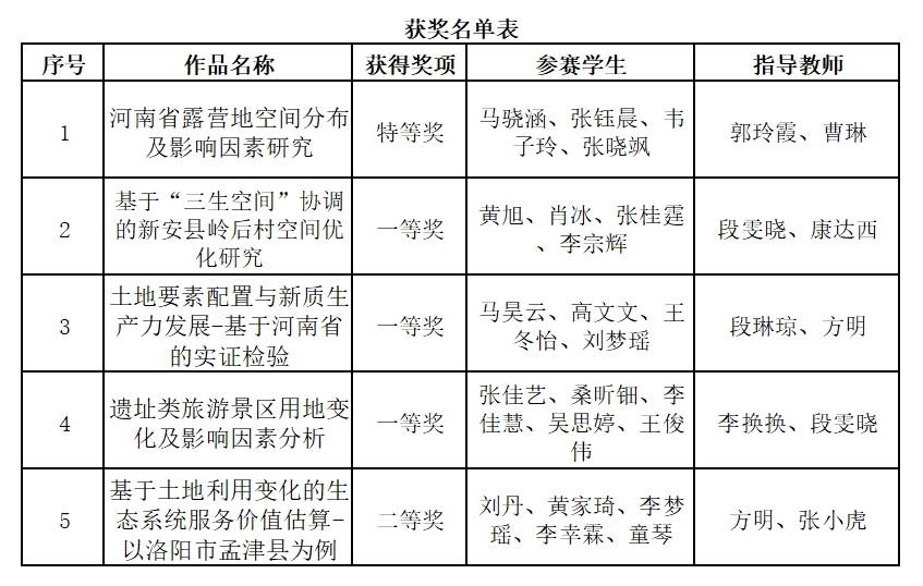 2024年11月16日,由河南省自然资源厅指导,河南省土地学会主办的河南省第四届大学生土地国情调查大赛在河南农业大学落下帷幕。来自全省18所院校的74项作品参加决赛。经过激烈角逐,我院派出的5支学生队伍荣获特等奖1项、一等奖3项、二等奖1项,并被授予优秀组织奖。