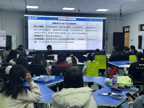 黄晓东博士在课堂上围绕“学什么”“怎么学”“毕业去向”三大部分展开讲解。在“学什么”部分,他向学生介绍了专业可发展的多个方向,强调扎实的专业知识是就业的基础,熟练运用测绘等专业工具才能更好的学习与实践。在“怎么学”部分,他分享了自己在大学期间如何制定学习计划,抓住课程重点,以及积极参加各种专业实践活动来提升自己动手能力的经历。他鼓励同学们积极参加全国大学生土地利用规划大赛、“挑战杯”创新创业大赛、Esri杯中国大学生GIS软件开发竞赛等。黄晓东博士说到,参加这些活动不仅将理论知识运用到实际,还有助于学会如何在团队中解决复杂问题,也将为今后同学们在求职面试中增添了有力的砝码。在“毕业去向”部分,他主要向同学们介绍了考研、考公、就业三个发展方向,并结合自身经济以及社会环境分别分析了三个发展方向的利与弊。与会同学纷纷表示,通过本次课程加深了对土地资源管理专业的认知,并对未来如何学习专业知识有了目标和方向,受益匪浅。