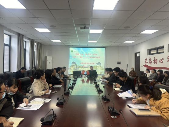 为了深入学习贯彻党的二十届三中全会精神,进一步提高全院教师的政治素质和业务能力,为推动学院的快速全面发展。11月21日,我院在A2-201举办科级干部、党员学习贯彻党的二十届三中全会精神培训班。院党委书记刘振中做主题宣讲报告,学院全体教职工参加会议。