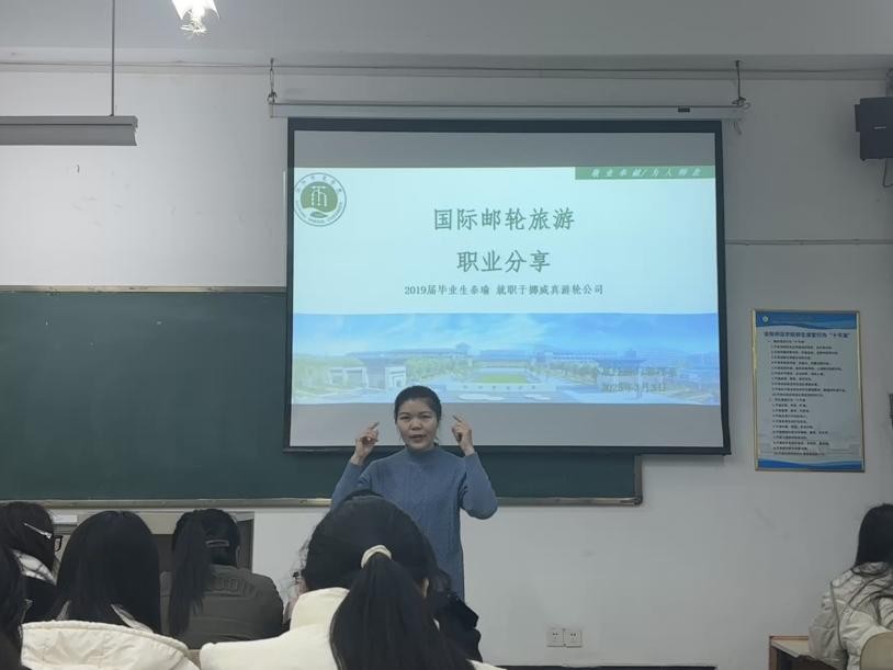 为拓宽学生的国际视野,为即将踏入社会的学子们提供宝贵的职业导航,2025年3月3日下午,我院在A1-125教室开展了校外名师暨行业导师进课堂——“国际邮轮旅游职业分享会,点亮学子就业新航向”主题讲座。本次讲座邀请到在挪威真邮轮(Norwegian Cruise Line)就职的我院2019届旅游管理专业优秀毕业生秦瑜担任主讲嘉宾。会展经济与管理、酒店管理、旅游管理专业学生以及教师代表参加了讲座,会议由会展经济与管理系党支部书记、系主任马遥主持,