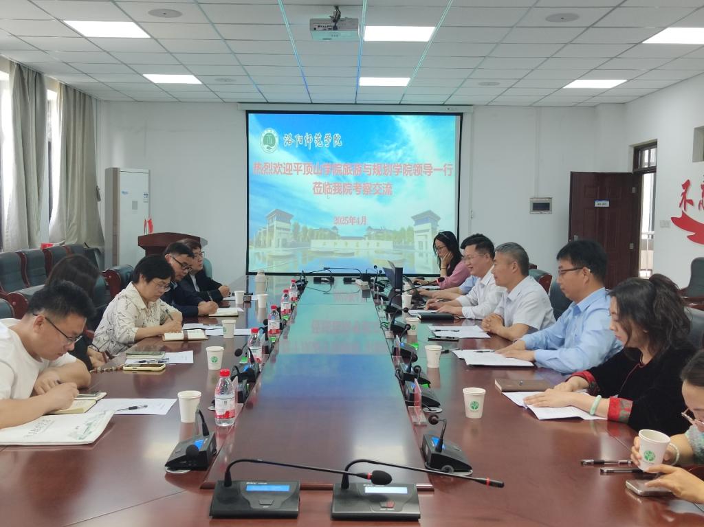 2025年4月22日下午,平顶山学院旅游与规划学院院长鲁迪教授、副院长钱宏胜等一行五人到我院考察交流。交流会在学院A2-201会议室召开,洛阳师范学院地理与旅游学院党委书记刘振中、院长王洪瑞、副院长杨会民、副院长曹威威、旅游管理系主任马荥、教师代表杨华夏博士参加,交流会由副院长杨会民主持。