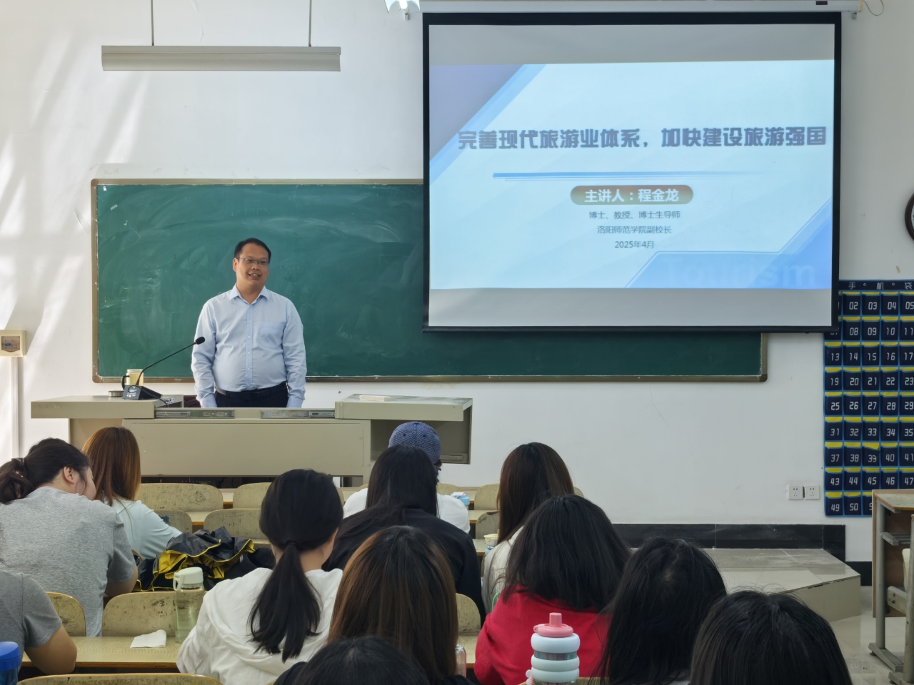 4月28日,洛阳师范学院副校长程金龙教授为2024级旅游管理专业专升本1班学生带来“完善现代旅游业体系,加快建设旅游强国”课程思政专题讲座,助力学生提升专业素养,厚植家国情怀。