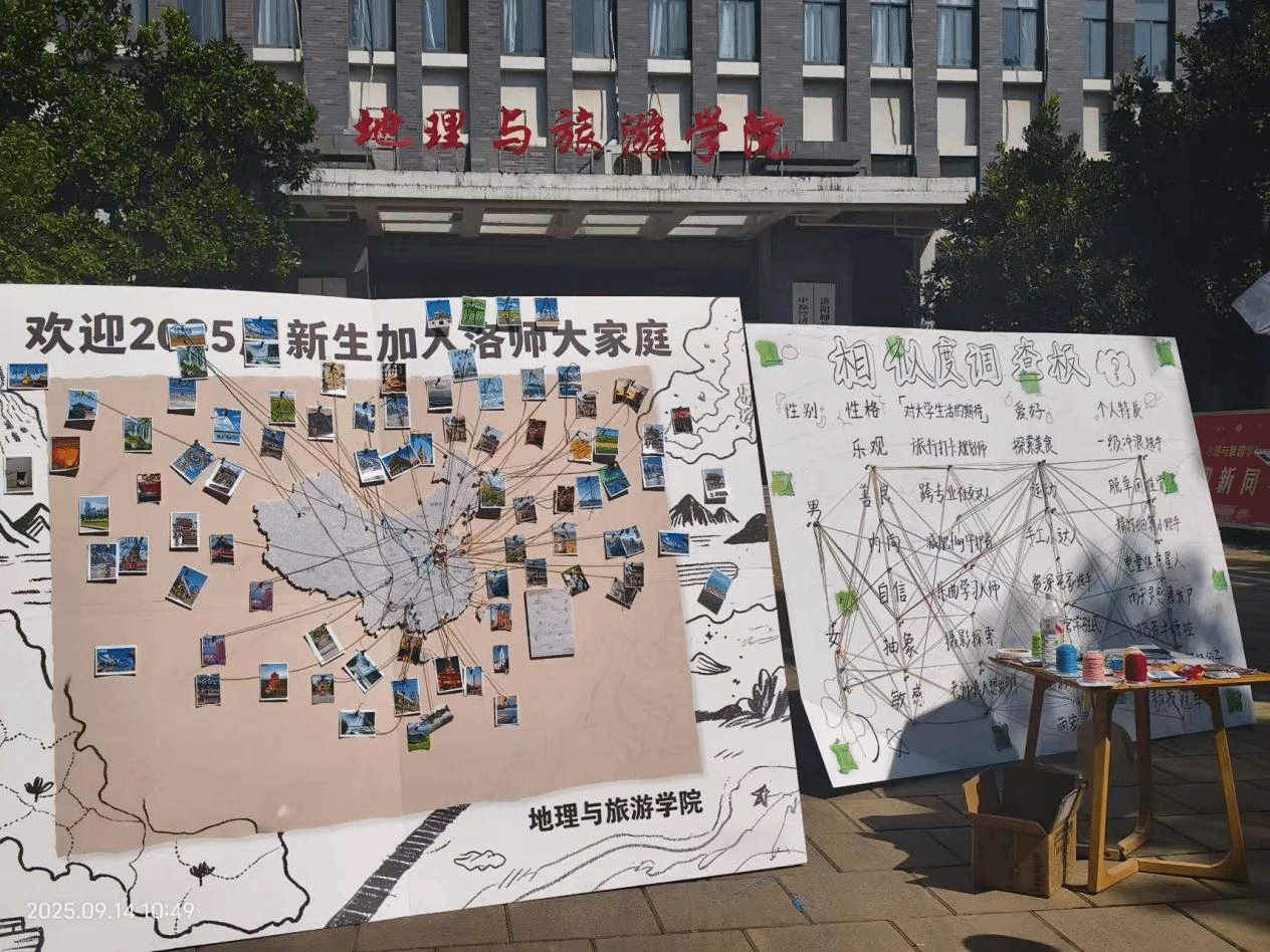 此次活动紧扣我院“旅游+地理”的学科专业特色,精心设计了三大沉浸式互动区域,将专业内涵与青春活力深度融合。在“寻根溯源,共绘青春地图”互动区,一张巨型中国地图成为全场焦点,来自全国各地的新生手持家乡特色照片,认真贴在地图对应的坐标上。从北国冰雪风光到南方的水乡景致,从西部大漠风情到东部海滨盛景,一张张照片串联起五湖四海的地域文化,不仅让新生们在互动中快速熟悉彼此,更让“地理”的空间概念变得生动可触,成为承载青春记忆与乡愁的独特载体。