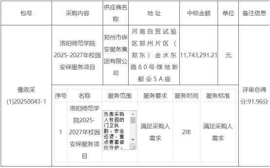 (2)采购内容:洛阳师范学院2025-2027年校园安保服务项目,主要服务内容为:负责采购人校园的门卫执勤、安全巡逻、重点要害部位守护、安防监控、消防监控、消防巡查、义务消防队、交通管理、大型活动安全、抢险救灾等安全保卫工作。协助、配合公安机关、保卫部门查处发生在校区内的一般刑事、治安案件,完成保卫部门交办的其他临时安全保卫任务等 ;配备人数不低于158人;