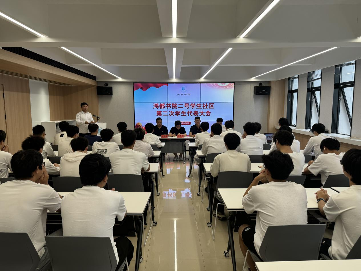 2025年6月19日,鸿都书院二号学生社区第二次学生代表大会在庄严的国歌声中拉开帷幕。书院党委副书记苏小丹、团委书记宋蒙蒙、团委副书记刘士英、育人导师王文齐以及学生代表33人出席会议。大会圆满完成了既定的各项议程,选举产生了新一届学生会主席团成员及出席洛阳师范学院第十次学生代表大会的正式代表,为书院的学生工作注入了新的活力。