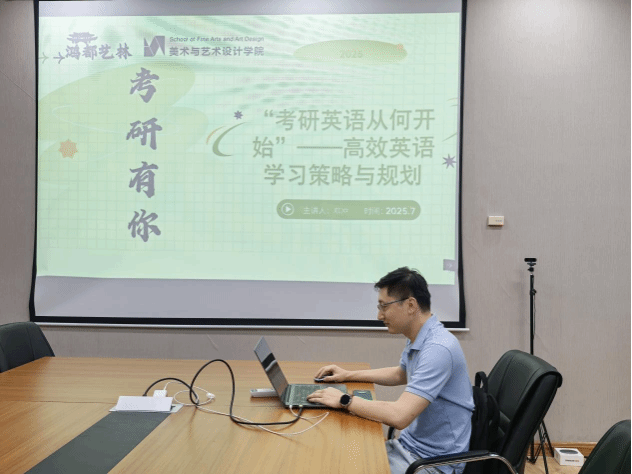 为帮助2026届考研学生在暑期高效推进复习,7月5日下午,美术与艺术设计学院联合鸿都书院尔号学生社区开展“考研有你”系列讲座第一期——“考研英语从何开始”。活动通过线下A109教室与腾讯会议线上同步进行,学院教师邓冲主讲,五十余名备考学生参与。