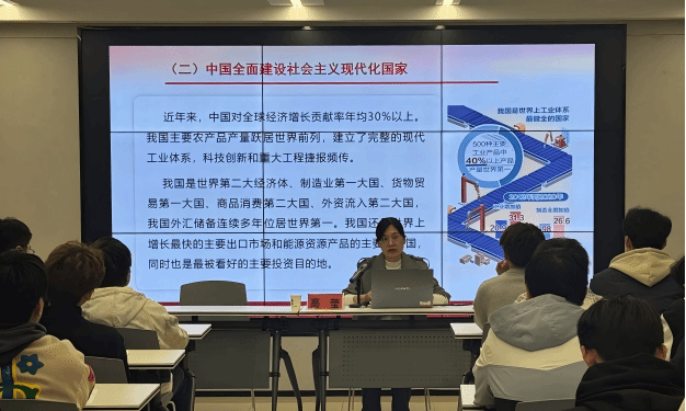 高莹从“两个大局”出发,深入剖析了当今世界正面临的百年未有之大变局以及中国全面建设社会主义现代化国家的历史地位。她引用党的二十大报告中的寄语,为整场培训奠定了基调。她在谈到中国的发展成就时,也特别提到了我国攻克多项“卡脖子”技术,展现了中国的强大实力和战略威慑力,激发了在场同学的使命感和责任感。