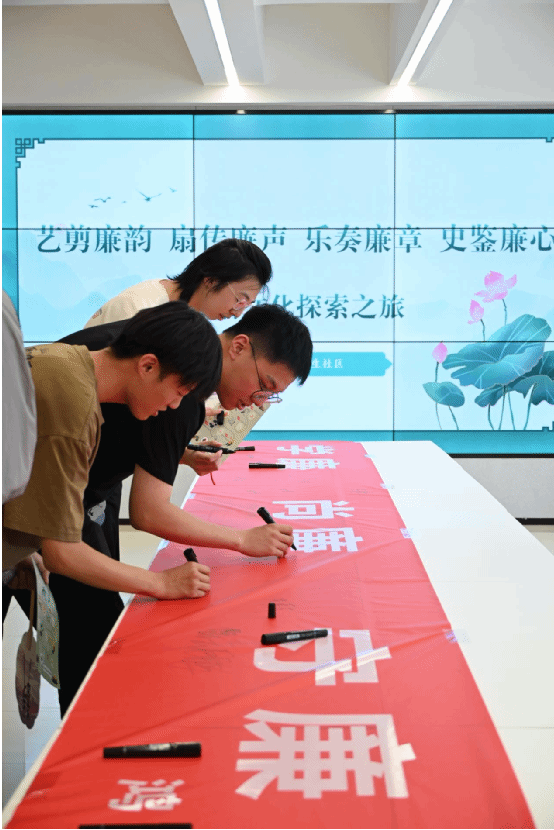 活动首站“知廉行远”关卡,师生们穿梭于廉洁剪纸展与海报展之间,驻足细观、踊跃答题,现场气氛热烈。在“廉动比猜”和“篆韵寻踪”关卡,师生们走进廉洁篆刻展与书画展,领悟文化传承,增加认同感。“清风绘廉”关卡将活动推向高潮。师生自制廉洁漆扇,融入廉洁元素,展现艺术才华和对廉洁的追求。“青音嘹亮”关卡,师生与廉洁作品合影并分享感悟,在互动交流中廉洁之风传递,加深理解与践行决心。“清风立约”关卡,师生在卷轴签名,将“廉洁从教、以德立身”承诺镌刻于心,引领学子筑牢思想防线。