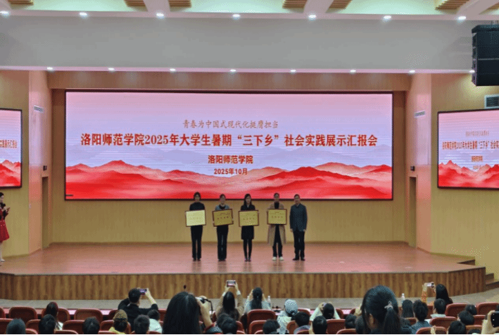 10月23日,洛阳师范学院2025年大学生暑期“三下乡”社会实践成果汇报会在逸夫楼圆满举行。鸿都书院二号学生社区选派的两支实践队伍凭借出色表现,“艺行青春”乡村墙绘志愿服务队荣获二等奖,“鸿秉初心志·先锋踏红途”红色寻访实践队荣获三等奖,书院同时获评“先进单位”荣誉称号。