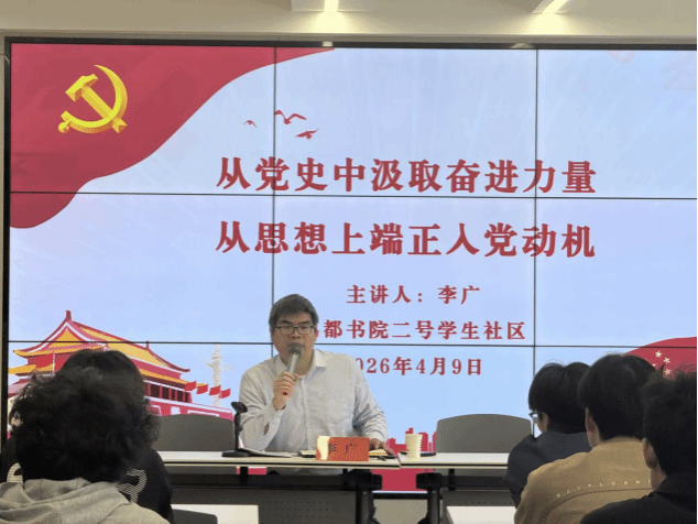 4月9日,鸿都书院二号学生社区党委书记李广在润心学堂讲授题为《从党史中汲取奋进力量 从思想上端正入党动机》的专题党课,书院积极分子和25名预备党员参与学习。
