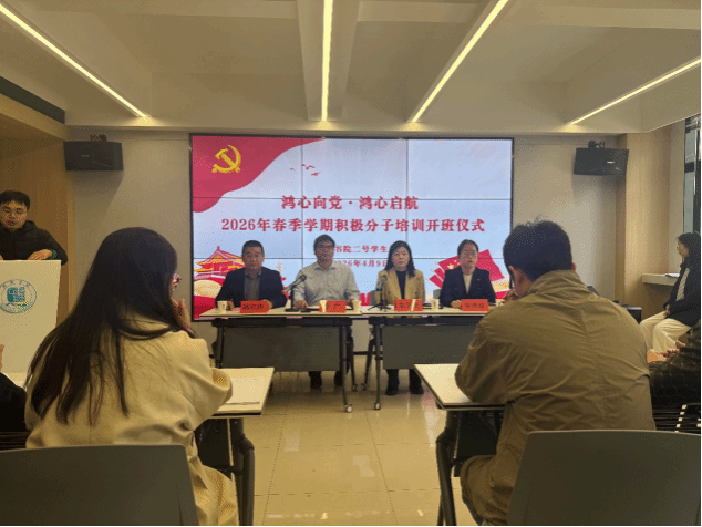 为深入学习贯彻习近平新时代中国特色社会主义思想,严格落实党员发展工作要求,筑牢入党积极分子思想根基,4月9日,鸿都书院二号学生社区2026年春季学期入党积极分子培训班开班仪式在润心学堂顺利举行。书院党委书记李广、院长朱玉晓,党委副书记邱红祥、常洁琼出席活动,育人导师王文齐主持仪式。