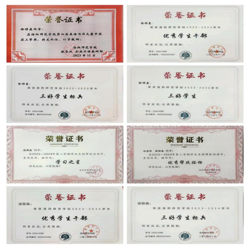 徐移森,共青团员,洛阳师范学院化学化工学院2022级化学专业。连续三年综合成绩位列班级第一,从学院学习部委员到负责人,至校学生会主席团成员,获得国家奖学金、国家励志奖学金、文明学生、十佳杰出青年、管理服务之星、三好学生、三好学生标兵、优秀学生干部、学习之星、英语写作大赛三等奖等多项荣誉。