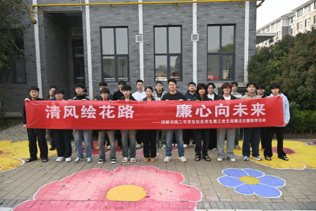 近日,鸿都书院二号学生社区学生第三党支部创新形式,组织开展了主题为“清风绘花路 廉心向未来”的廉洁教育活动。本次活动将廉洁文化建设与校园美化相结合,组织学生党员和入党积极分子在书院附近的道路上进行地面彩绘,以艺术实践涵养清廉品格。