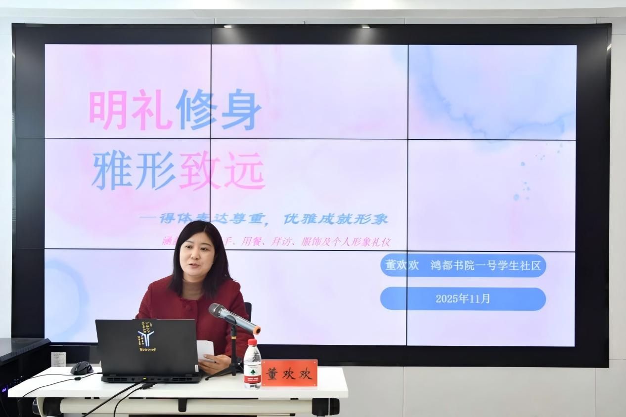 为引导青年学子涵养文明素养、塑造良好形象,在人际交往中践行尊重之道、彰显青春风采。11月25日,鸿都书院一号学生社区院长董欢欢为书院社区团委、学生会各部门负责人及青马班成员等团学干部开展“明礼修身,雅形致远”专题培训。
