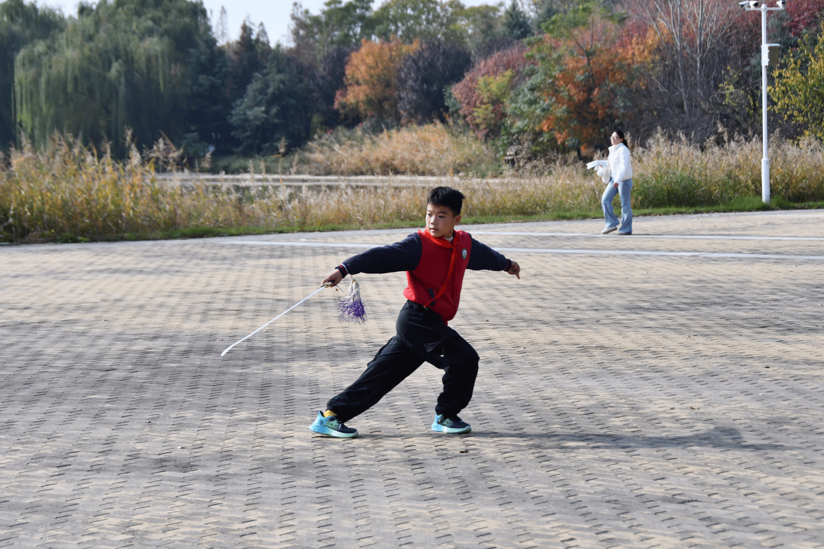 紧接着,一系列独具特色的表演轮番上阵。刚猛迅捷的南拳、行云流水的太极拳,让孩子们领略了不同拳种的风采;刀光剑影的器械表演更是将现场气氛推向高潮,队员们手持长枪、利剑、双刀等传统兵器,闪转腾挪,攻防有度,令人目不暇接。