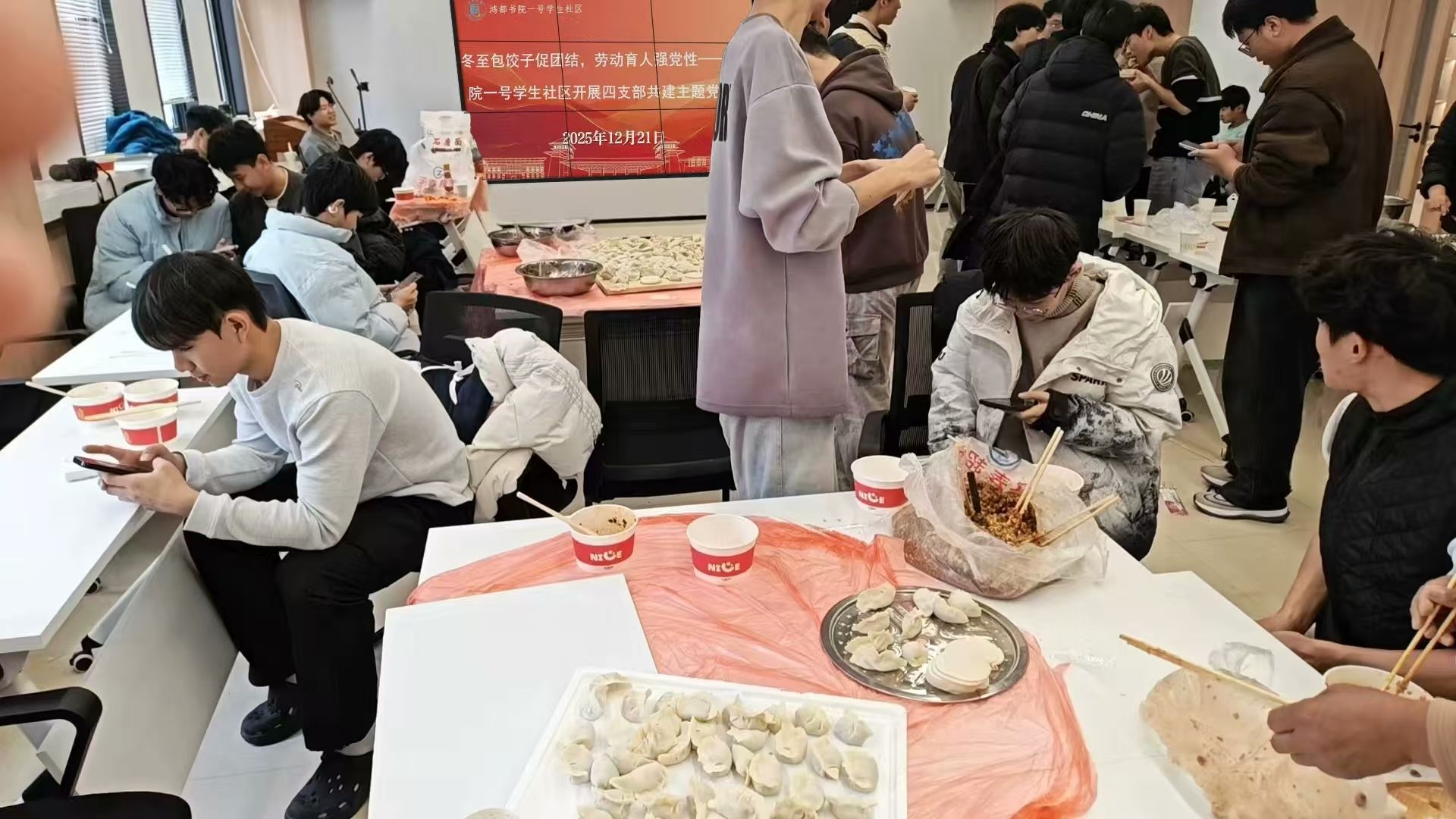 冬至阳生,岁寒情暖。为弘扬中华优秀传统文化,丰富支部组织生活形式,12月21日冬至当天,鸿都书院一号学生社区党委联合所属支部,面向全体学生举办“情暖冬至,饺香凝心”包饺子主题活动。各支部教师党员、学生党员、入党积极分子积极参与,在亲手包饺子的劳动实践中感受传统文化,增强交流协作。