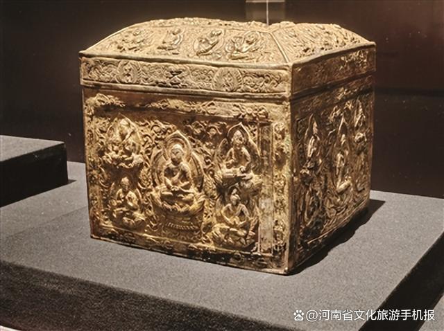 这件文物名为鎏金四十五尊造像盝顶银宝函,同样出土自法门寺地宫。它造型方厚,长、宽、高均17厘米,重达1612克,虽距今已有1100多年,但依然光彩夺目。