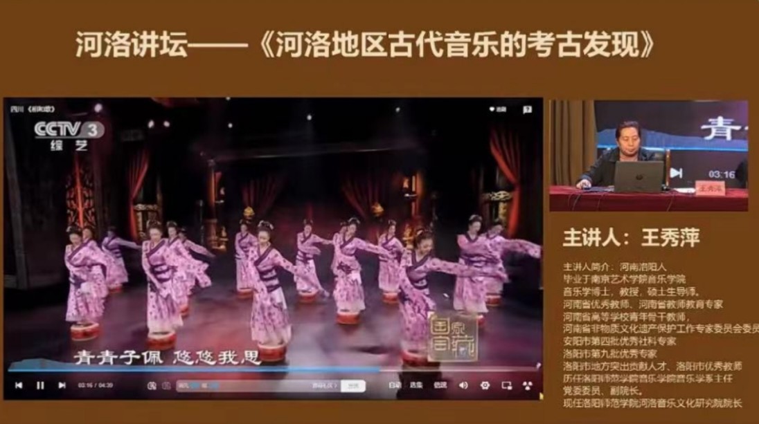 王秀萍教授以河洛地区、古代音乐、考古发现等相关概念的界定作为切入点,从河洛地区古代音乐考古工作的开展情况、出土音乐文物的种类、二里头等几处重要遗址的音乐考古以及河洛地区古代音乐考古成果在当代社会音乐生活中的活态应用几个方面详细阐述了河洛地区古代音乐考古所取得的丰硕成果,让观众在接受音乐考古知识熏陶的同时了解河洛地区在古代音乐领域所取得的辉煌成就和发展水平,感受文物背后所蕴含的厚重的音乐文化,进一步增强了对河洛地区地域音乐文化的了解和热爱。